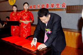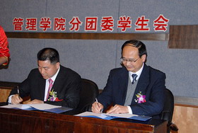 管理學院領導為董事長楊勇頒發了“重慶工商大學管理學院大學生創業導師”聘書。董事長楊勇與管理學院簽署了“創業實習共建基地協議書”,并為本次論壇題寫了“超越夢想,成就自我”的題詞。