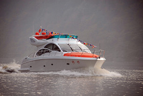 2010年11月11日16:50時,隨著清脆的笛音、參觀人群的歡呼聲、照相機的咔嚓聲,重慶市有史以來自主建造的最大規(guī)格豪華游艇--“躍浪”順利停靠在南濱路驕陽游艇俱樂部游艇碼頭。